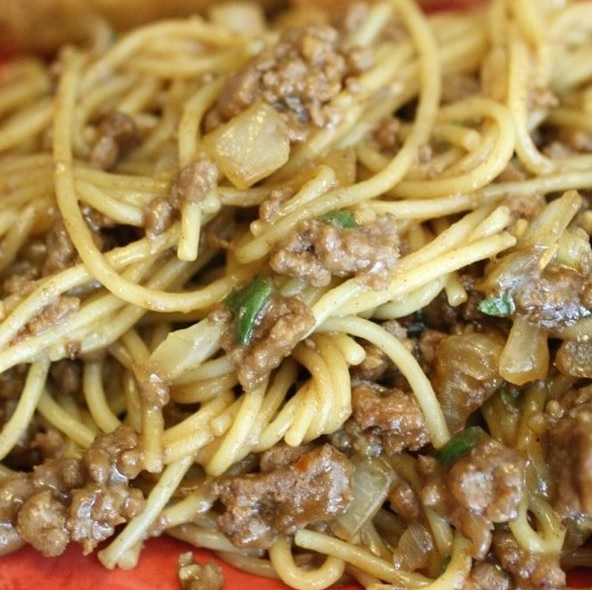 We spooned the meat sauce over the noodles just like spaghetti with red sauce. I learned the first time I went to a potluck dinner in Philadelphia that they call spaghetti sauce gravy. It sounded strange to me the first time I heard it. To me, gravy does not have tomato sauce in it, only meat drippings, flour and milk. So in this case, I think I do feel comfortable calling this sauce gravy, with an Asian flavor.